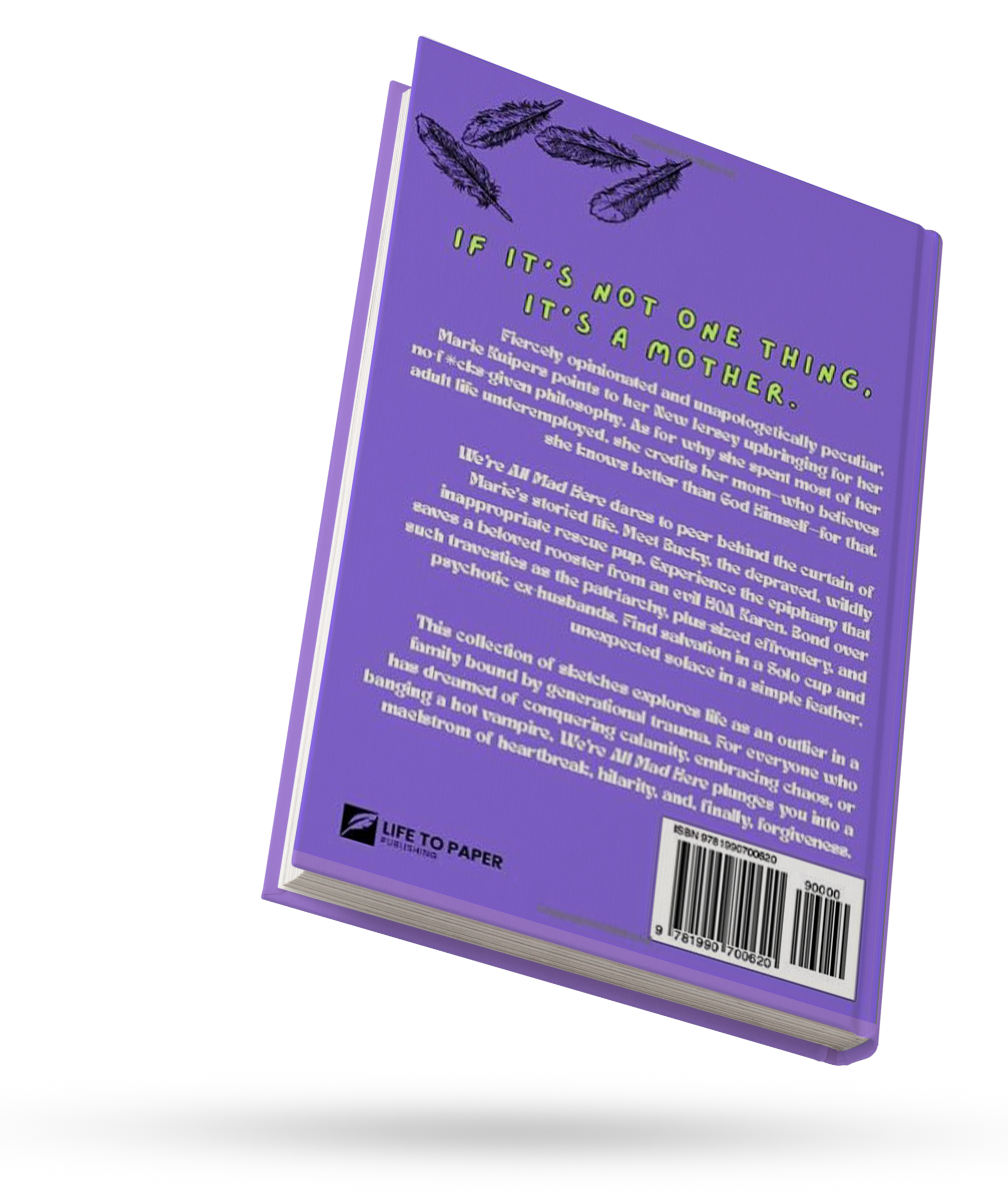We’re All Mad Here dares to peer behind the curtain of one woman’s unhinged life. Meet Bucky, the depraved, wildly inappropriate rescue pup. Join her in censuring such horrors as murderous umbrellas and, obviously, Steely Dan. Experience the epiphany that saves a beloved rooster from an evil HOA Karen. Bond over such atrocities as puke, the patriarchy, and plus-sized effrontery. Find unexpected solace in a simple feather.